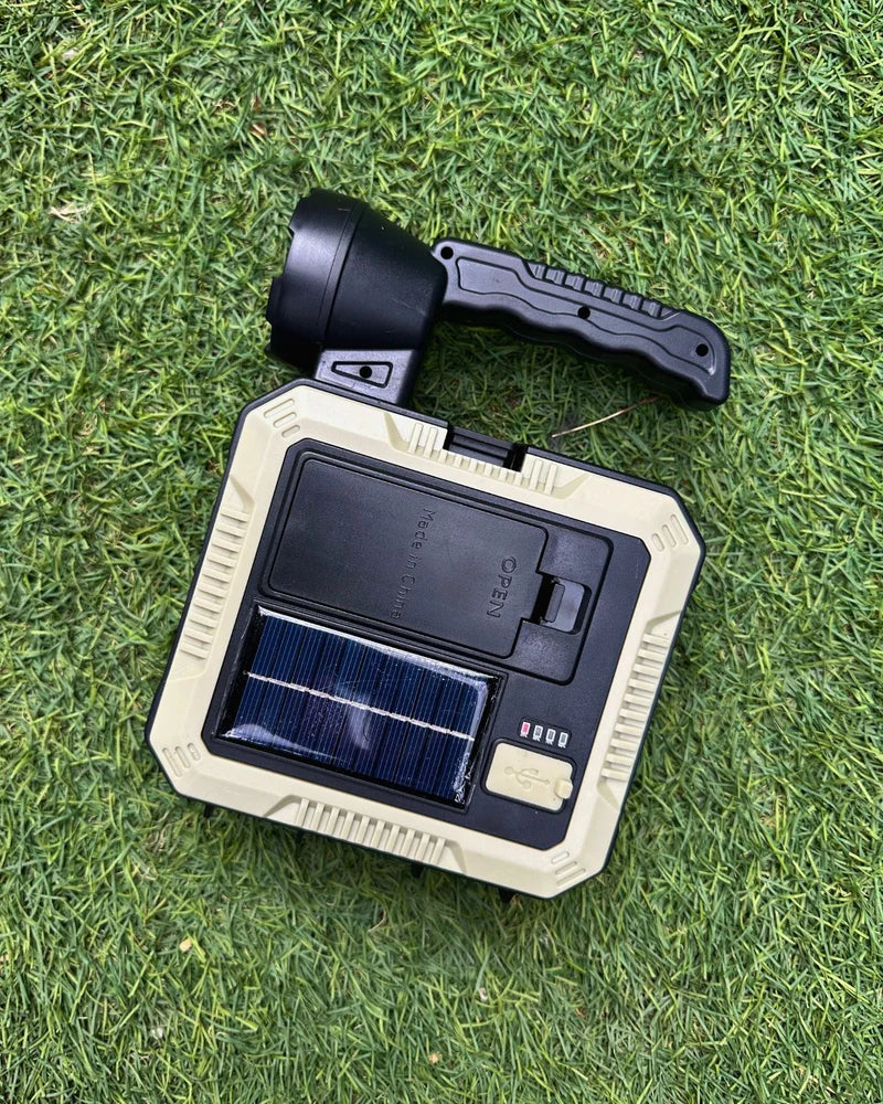 Se carga por panel solar y tiene entrada USB, así que puedes recargar tu celular o radio incluso sin corriente.